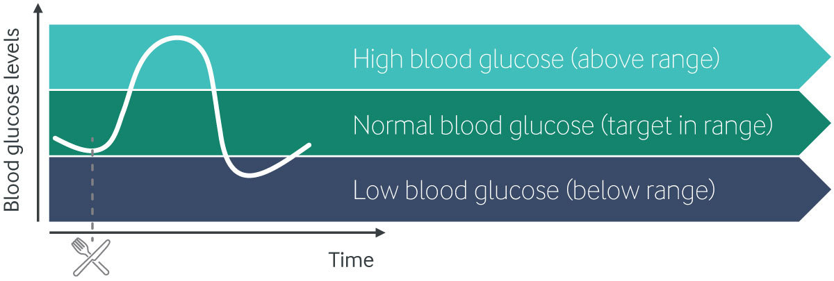 For people with diabetes, fluctuations in blood glucose levels are normal, both after a meal and throughout the day. However, if blood glucose levels are too high for too long, the risk to long-term health and quality of life is increased. For this reason, the recommendation is that blood glucose levels should be below 5.5 mmol/L during fasting periods and below 7.8 mmol/L for at least 90 minutes after a meal. The key to successful blood glucose regulation is to reduce periods of hyperglycaemia (too high blood glucose levels) and hypoglycaemia (too low blood glucose levels).