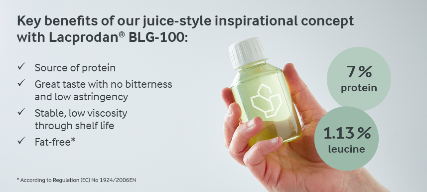 Our juice-style drink concept with Lacprodan® BLG-100 is a new opportunity for manufacturers of oral nutrition supplements (ONS) targeting the dietary management of malnutrition and muscle loss – by developing appealing, alternatives to the traditional milky drinks that continue to be the primary offer to this segment.